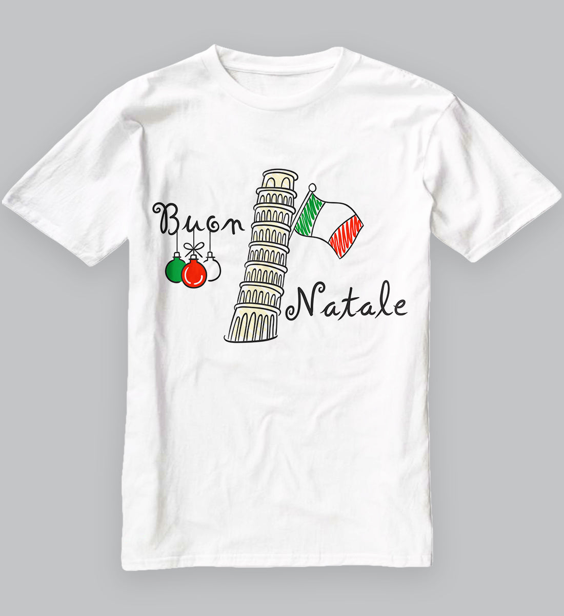 Celebrate the festive season in style with this "Buon Natale" Christmas T-Shirt! Featuring an Italian flag and tower of Pisa, this shirt is perfect for anyone with a love for Italy and the holidays. Show off your Italian heritage or simply spread holiday cheer with this eye-catching design. Whether you're out and about running errands or gathering with friends and family, this T-Shirt is sure to make a statement. Get into the holiday spirit with this unique and trendy design today!