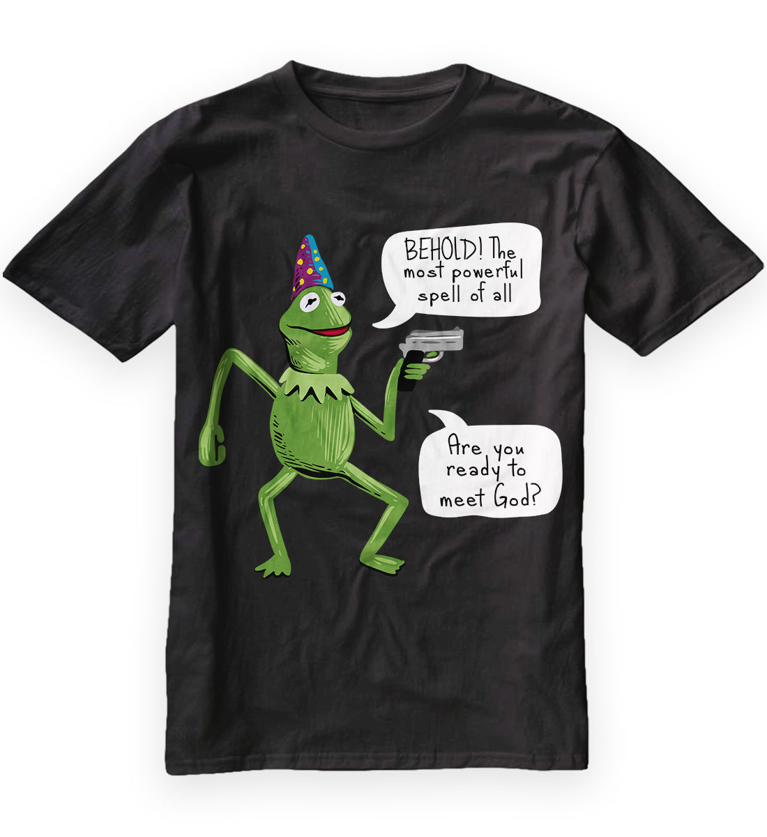 Looking for a unique t-shirt that's sure to turn heads? Look no further than this Wizard Kermit with Gun t-shirt, featuring the Muppet magician holding a wand and firearm with the phrase "Behold the most powerful spell of all. Are you ready to meet God?" Whether you're a fan of the Muppets, Harry Potter, or just appreciate a good meme, this t-shirt is perfect for anyone who wants to add some humor and magic to their wardrobe. Made with high-quality materials and a comfortable fit, this t-shirt is sure to become a favorite for any occasion. Get yours today and show off your love for Kermit the Frog and all things wizardly!