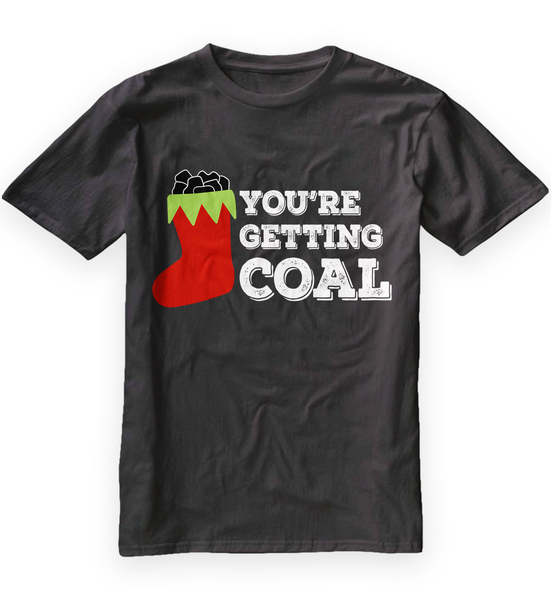 Celebrate the holiday season in style with this playful and festive t-shirt! Featuring a humorous design, this shirt is sure to bring a smile to everyone's face. The bold text reads "You're Getting Coal" in a fun and playful font, making a nod to the traditional holiday story of naughty children receiving coal instead of gifts from Santa Claus. The comfortable and durable material ensures that you'll feel great all day long, whether you're running errands, attending a holiday party, or simply lounging at home. So why wait? Order yours today and get ready to spread some holiday cheer!